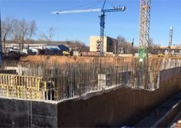 В первом и третьем корпусе в новостройке рядом с метро «Октябрьское поле» заливается фундаментная плита. В четвертом корпусе ведется активное строительство подземного гаража. Рабочие приступили к монтажу стен.